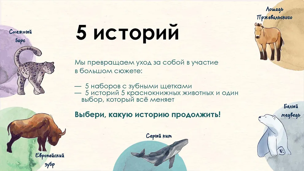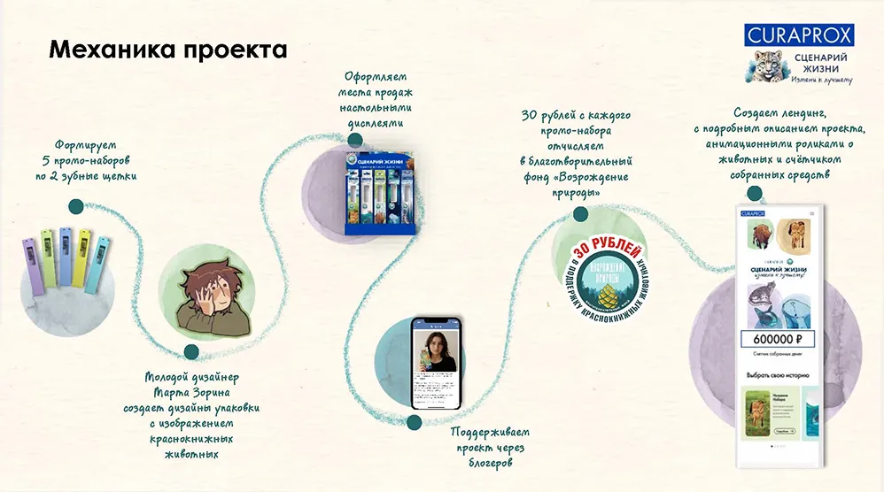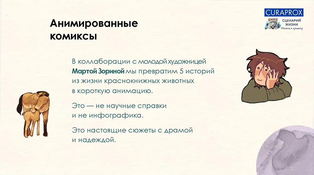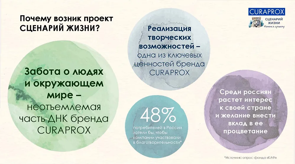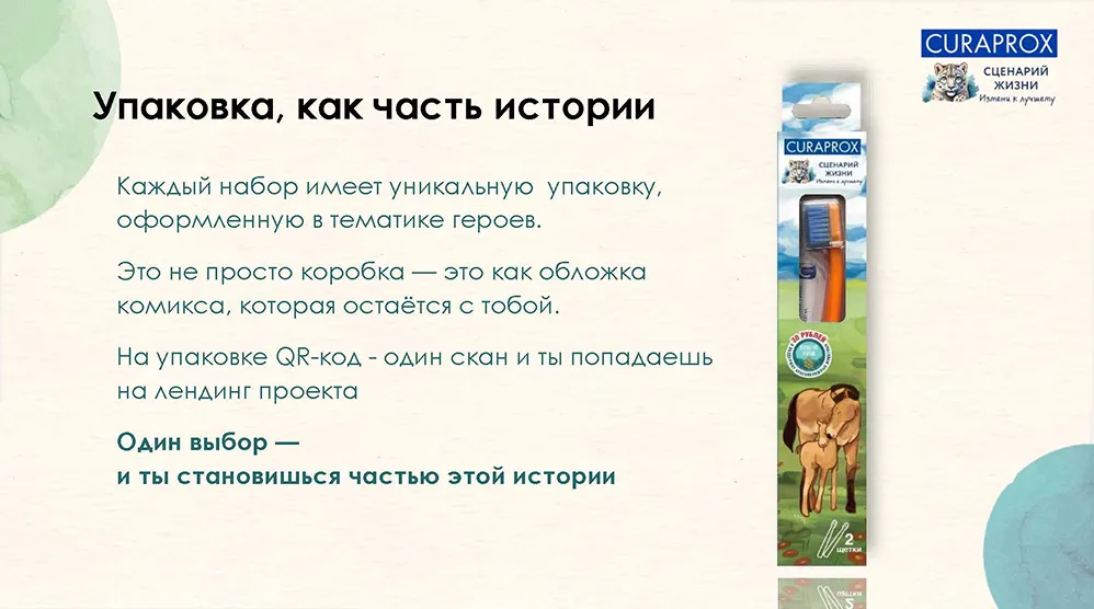 Благотворительный фонд «Возрождение Природы» и известный бренд CURAPROX представляют совместный проект «Сценарий жизни». Проект призван привлечь внимание к проблемам экологии и сохранению биоразнообразия. Каждый купленный набор помогает поддерживать программы охраны и восстановления популяций лошади Пржевальского, зубра Европейского, снежного барса, серого кита и белого медведя.